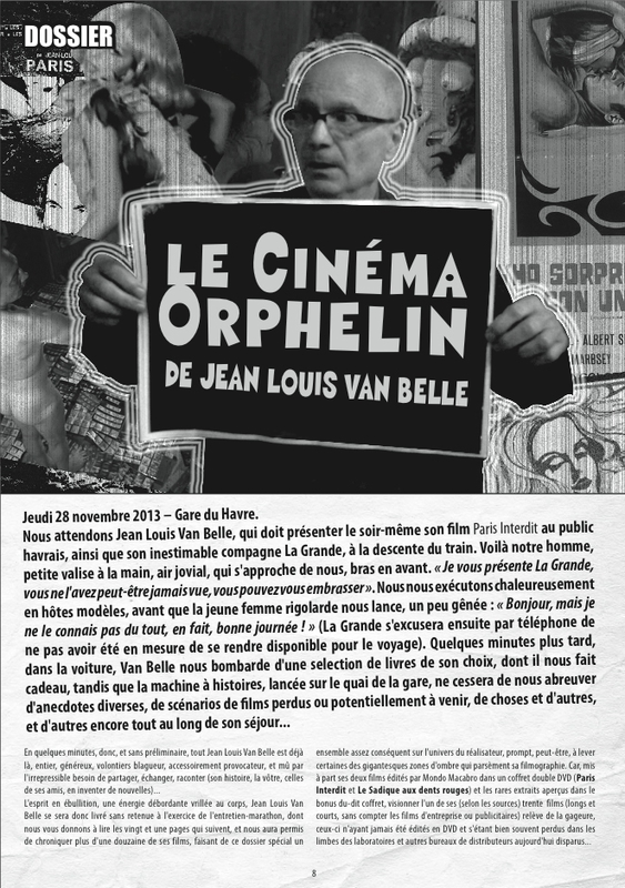 – Le Cinéma orphelin de Jean Louis Van Belle : entretien fleuve avec le réalisateur de Paris interdit et Le Sadique aux dents rouges (21 pages) + Filmographie passée au crible (19 pages)