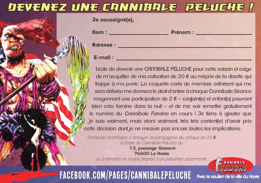 Je brûle de devenir une CANNIBALE PELUCHE pour cette saison et exige de m’acquitter de ma cotisation de 20 € au mépris de la disette qui frappe à ma porte. La coquette carte de membre adhérent qui me sera délivrée me donnera le droit d’entrer à cahque Cannibale Séance moyennant une participation de 2€ – conjoint-e et enfant-s pourront bien crier famine dans la nuit – et de me voir remettre gratuitement le numéro du Cannibale Fanzine en cours ! Je tiens à ajouter que je suis vraiment, mais alors vraiment très très content -e d’avoir pris cette décision dont je ne mesure pas encore toutes les implications.