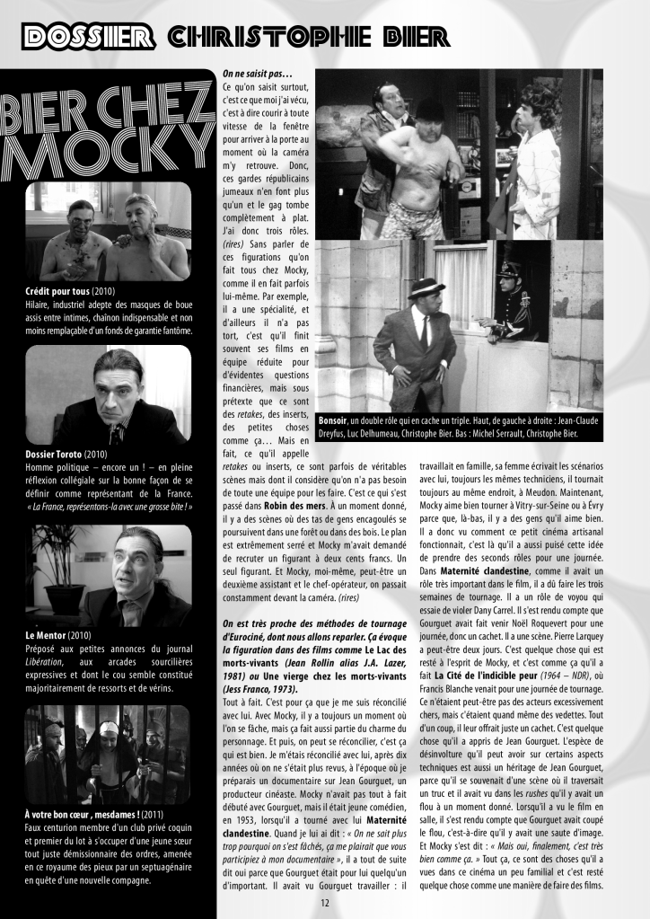 Spécialiste ès sujets marginaux, acteur, directeur de casting et assistant de Jean-Pierre Mocky, réalisateur de documentaires sur le cinéma, auteur sous divers pseudonymes de romans aux fortes tonalités sadomasochistes, auteur de deux pièces radiophoniques tout aussi placées sous le sceau de la flagellation et des modifications corporelles, chroniqueur pour l’émission Mauvais Genres, pour Mad Movies et moult autres publications, fanéditeur, éditeur en solo ou au sein de Serious Publishing, coordinateur du dictionnaire le plus rigoureux et étonnant qui soit, expert en nains à l’écran… les chapeaux et les étiquettes abondent pour présenter Christophe Bier.